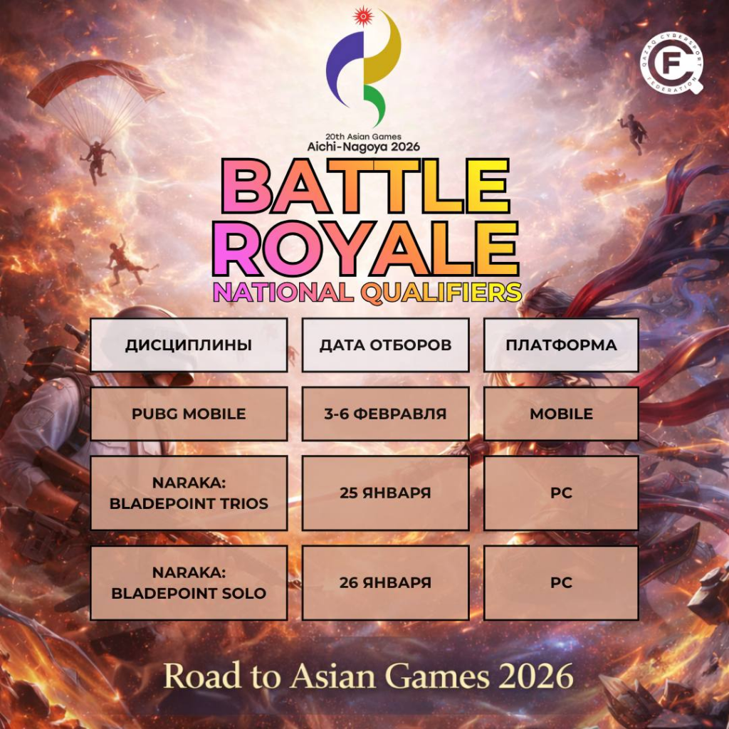 Qazaq Cybersport Federation объявляет о проведении национальных онлайн-отборов по дисциплинам Battle Royale в рамках формирования национальной сборной Республики Казахстан для участия в Asian Games 2026.